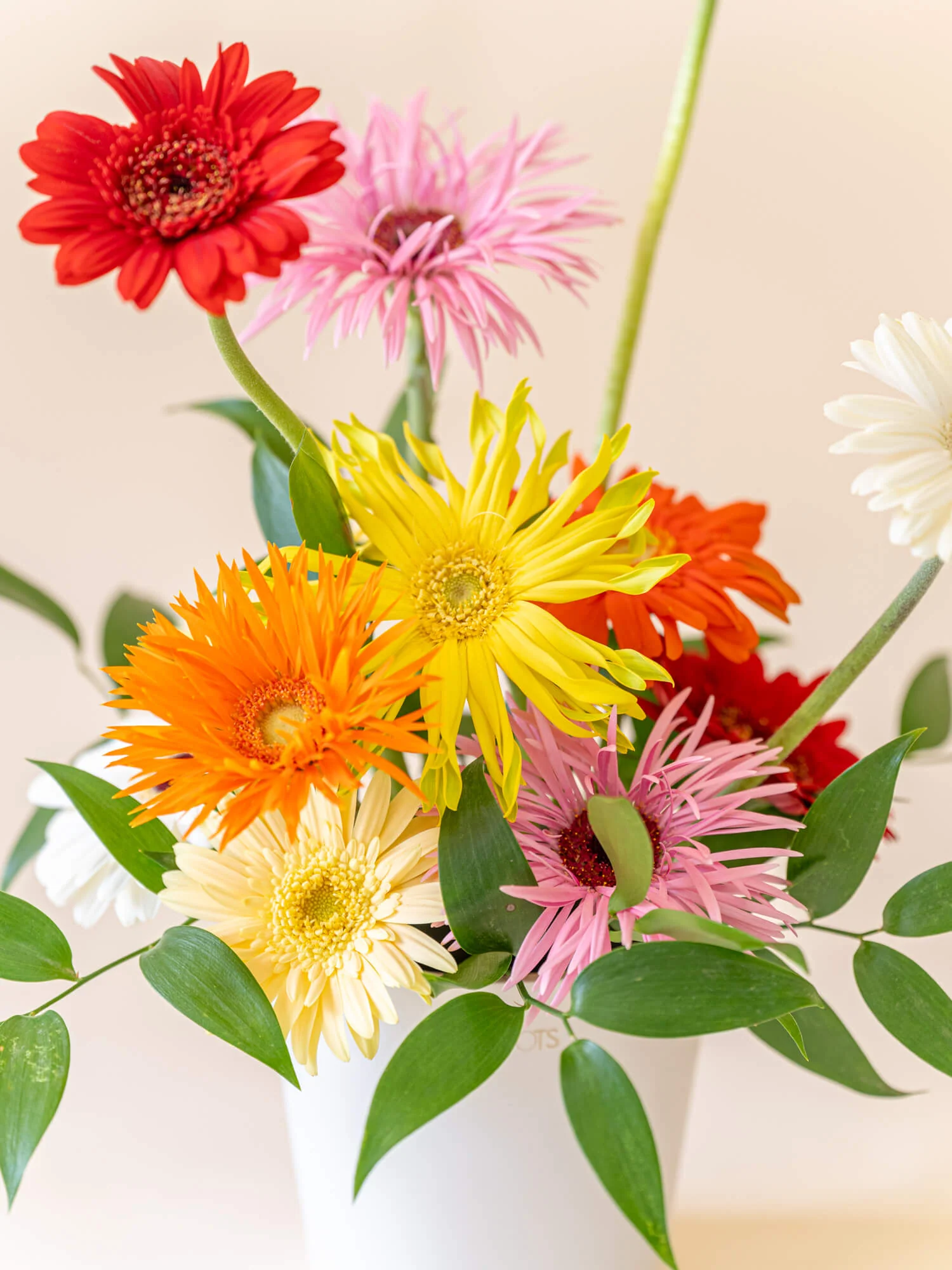 アンドプランツのフローリストが提案する、ガーベラとグリーンのみで合わせたアレンジメントです。
