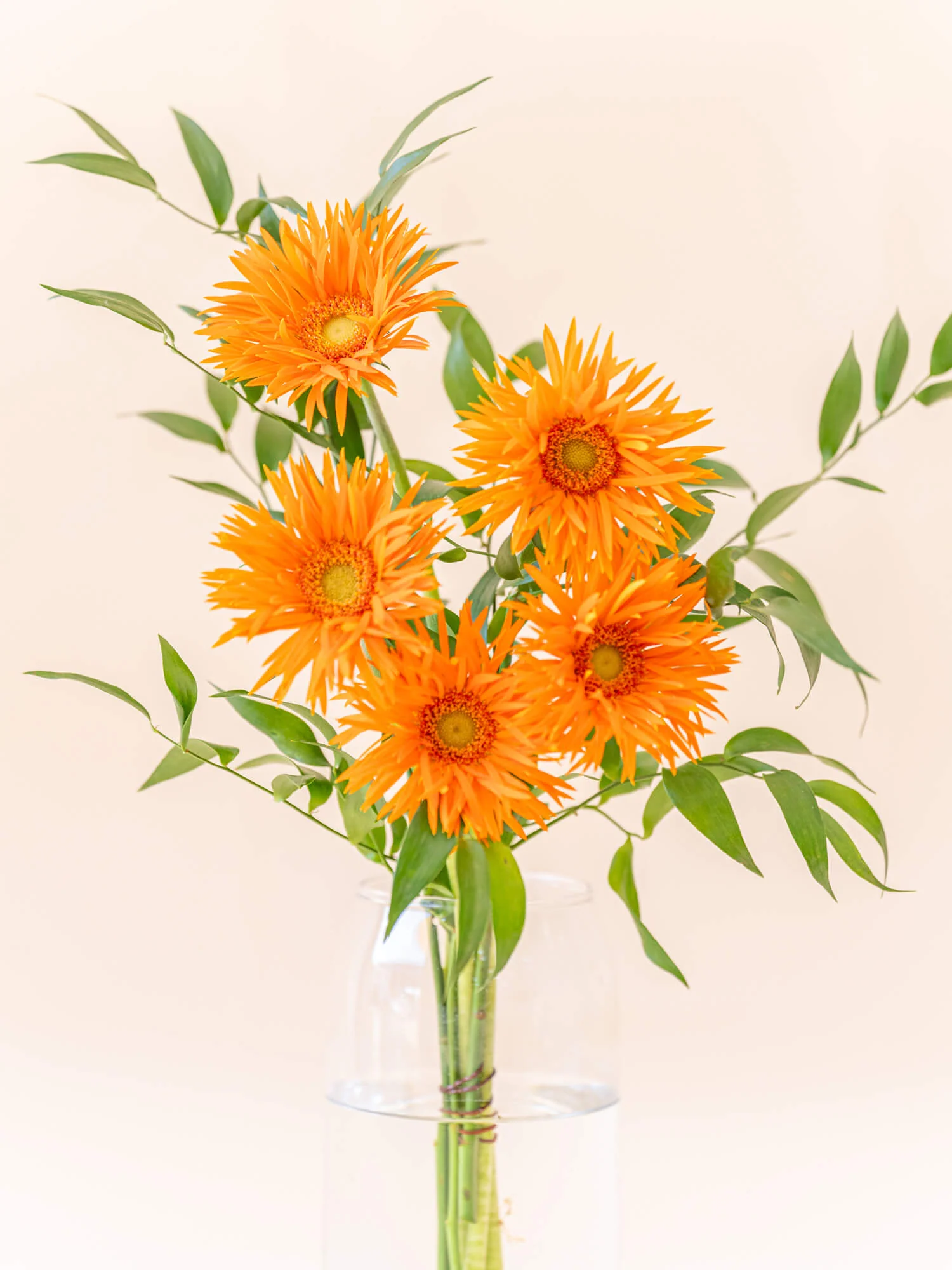 アンドプランツのフローリストが提案する、ガーベラとグリーンのみで合わせた花束です。