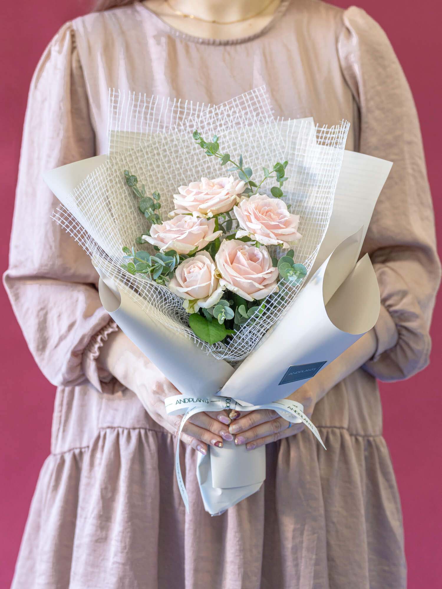 アンドプランツのフローリストが提案する、バラとグリーンのみで合わせた花束です。
