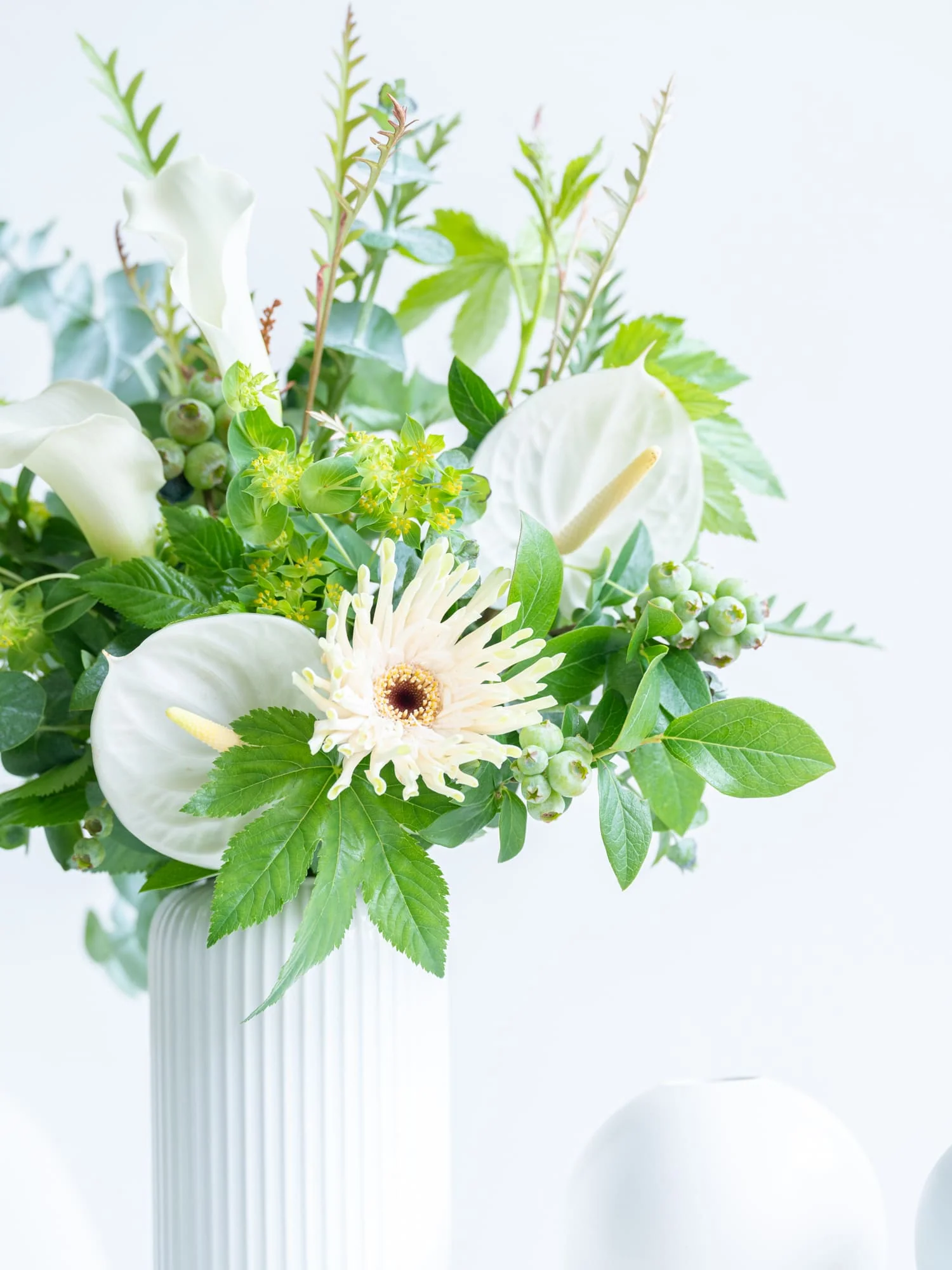 季節に合わせた旬のお花をメイン花材とし、そのお花に合った色味の花材やフレッシュな葉物を組み合わせてご提案します。