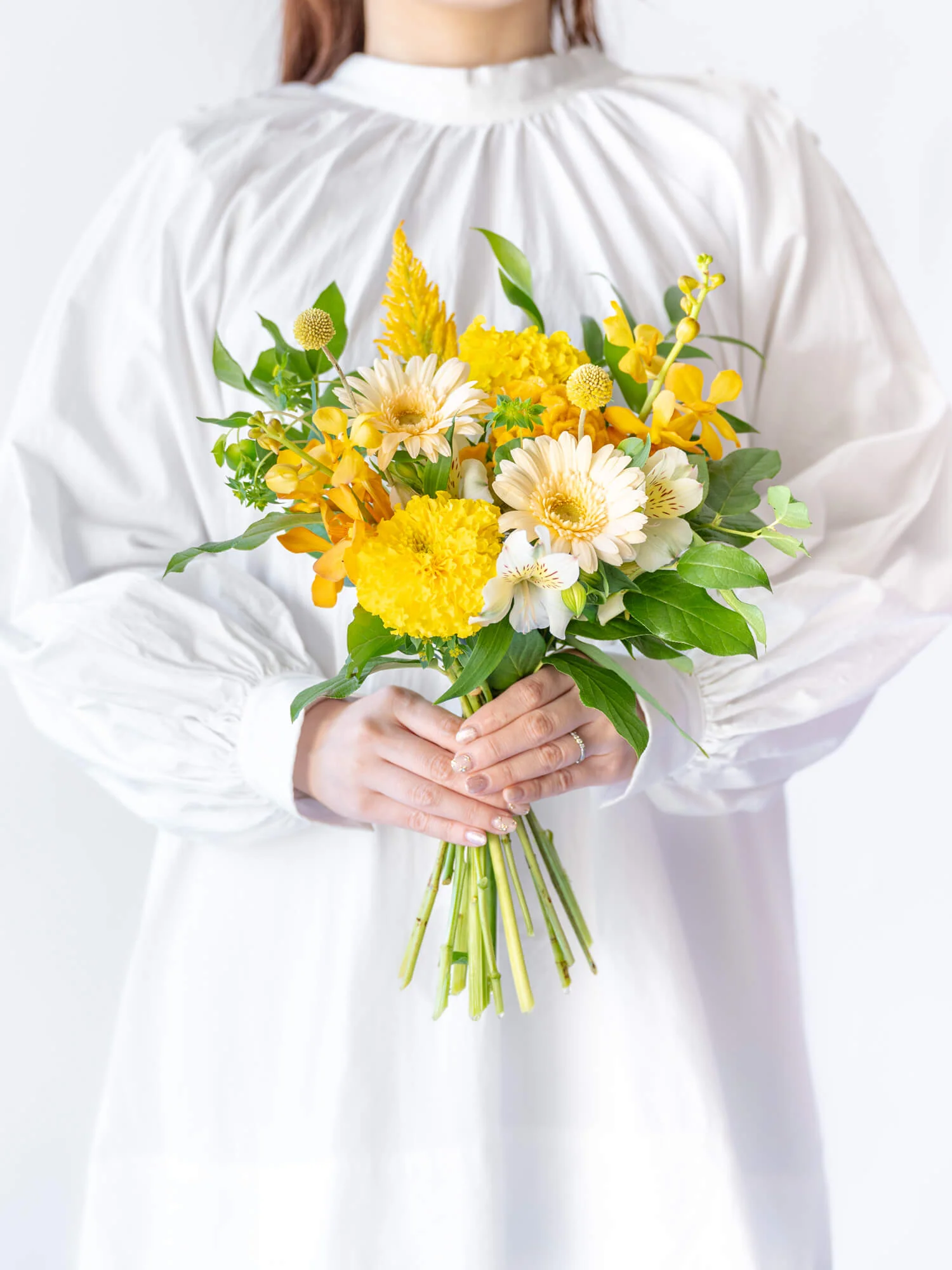明るく前向きな印象を与えるイエローの花束は、門出のお祝いやカジュアルなギフトにも最適なカラーです。目で楽しむ美しさはもちろん、箱を開けた瞬間に広がるフレッシュなお花の香りも魅力のひとつです。