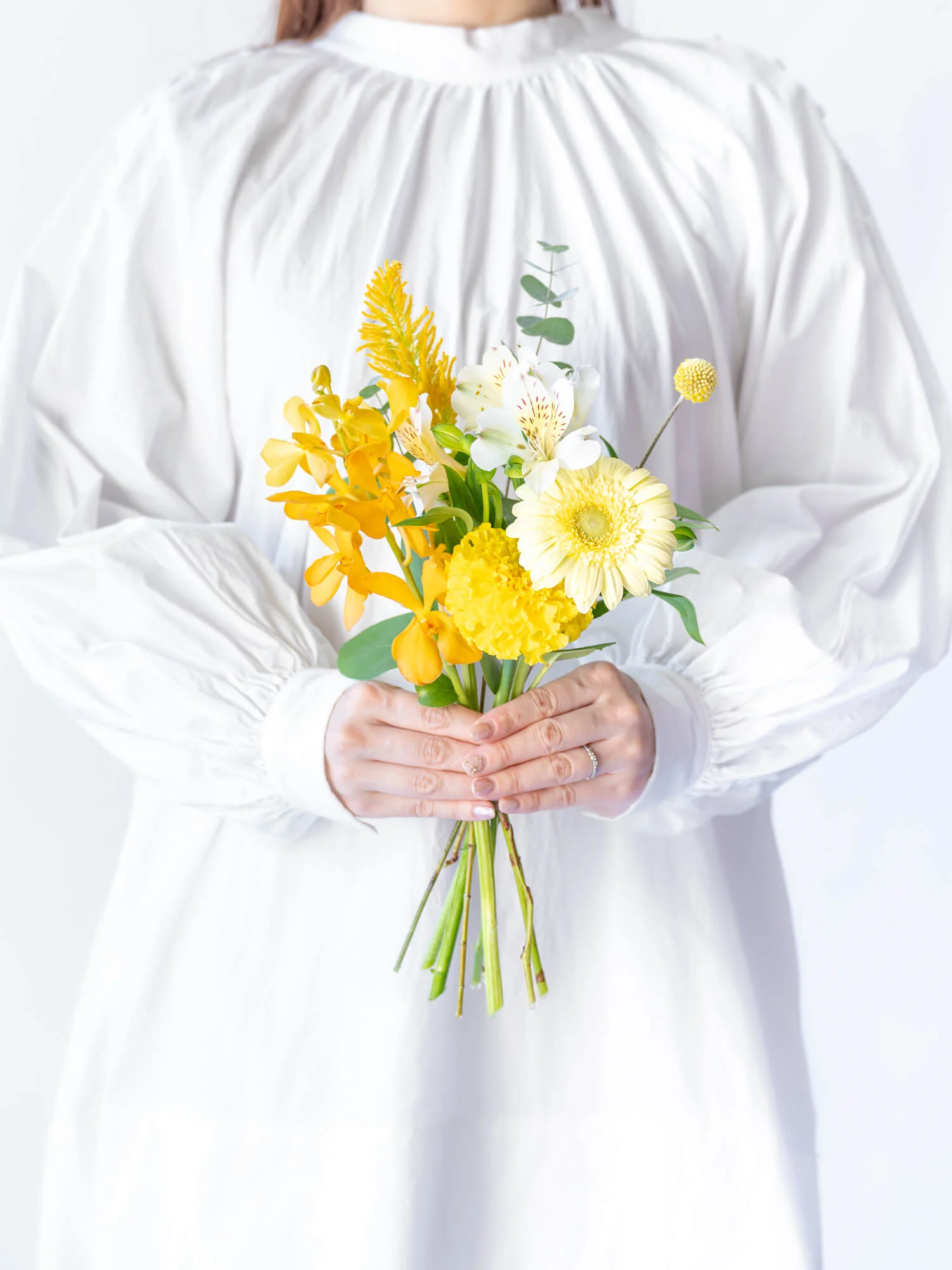 明るく前向きな印象を与えるイエローの花束は、門出のお祝いやカジュアルなギフトにも最適なカラーです。目で楽しむ美しさはもちろん、箱を開けた瞬間に広がるフレッシュなお花の香りも魅力のひとつです。