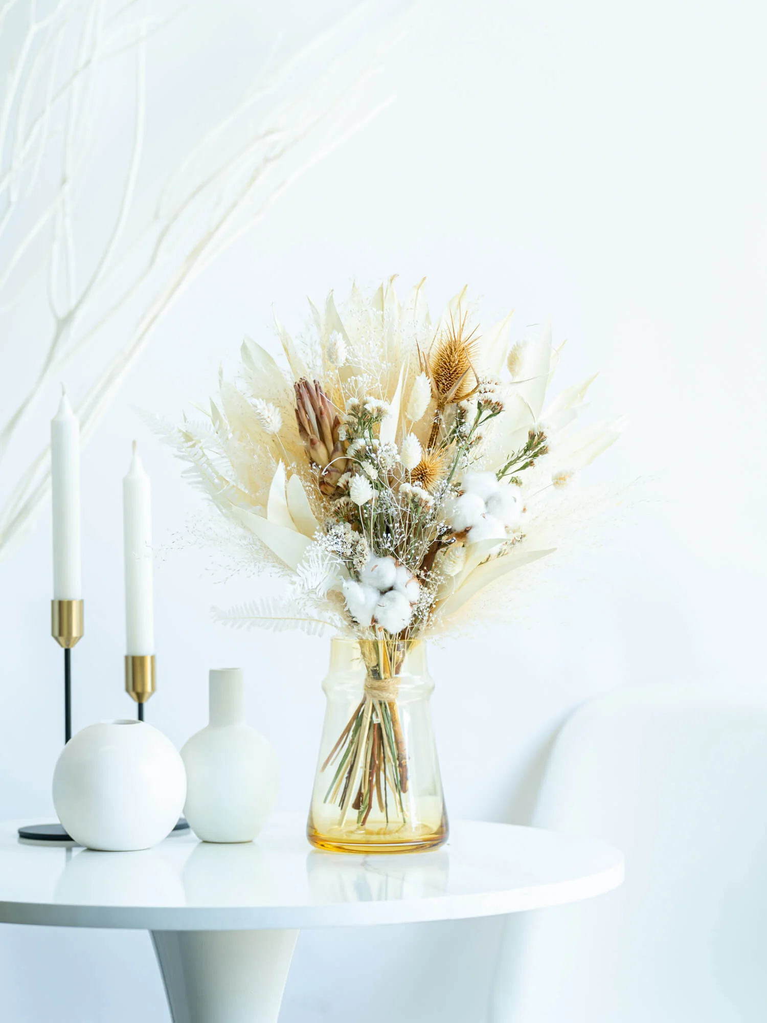 ドライフラワーの花束で食卓やキャビネットを華やかに演出しませんか?AND PLANTSおすすめの花瓶とセットで購入できるほか、ご自宅にある花瓶に入れていただくこともできます。天然の色味が作りだす繊細な美しさをお届けします。 白ベージュ系の色味は、手に取っていただいた時のままほとんど退色がございません。お部屋のインテリアにも馴染みやすく、長くお楽しみいただけます。
