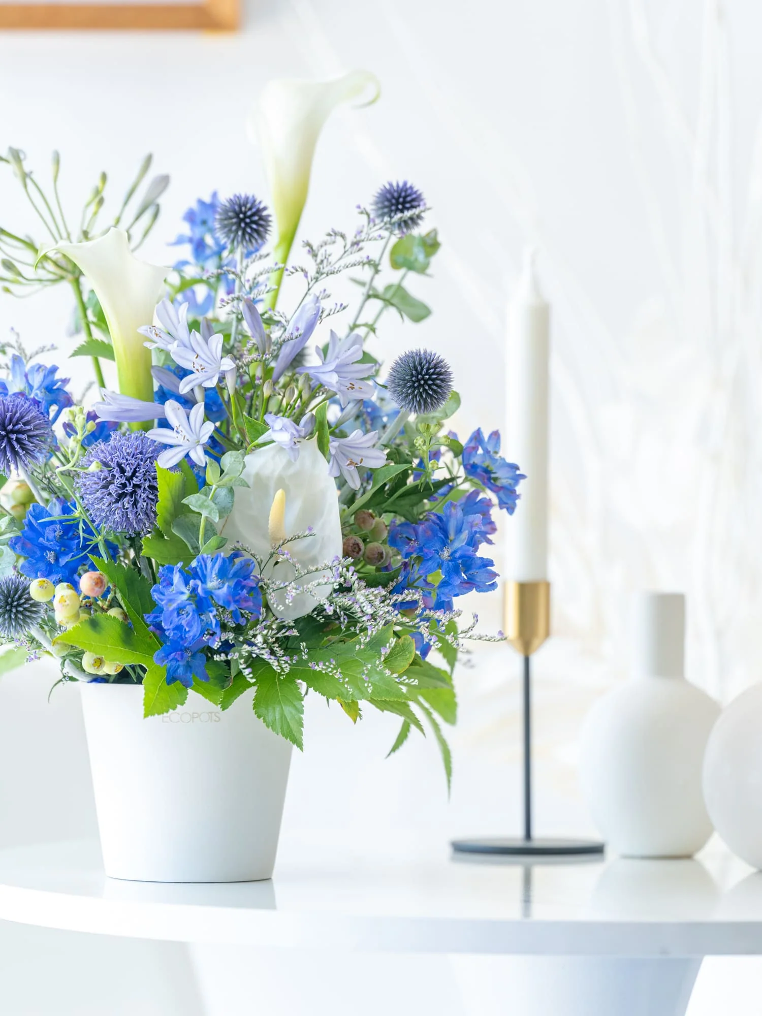 季節に合わせた旬のお花をメイン花材とし、そのお花に合った色味の花材やフレッシュな葉物を組み合わせてご提案します。器が付いた状態ですので、届いてすぐに飾って楽しんでいただけます。