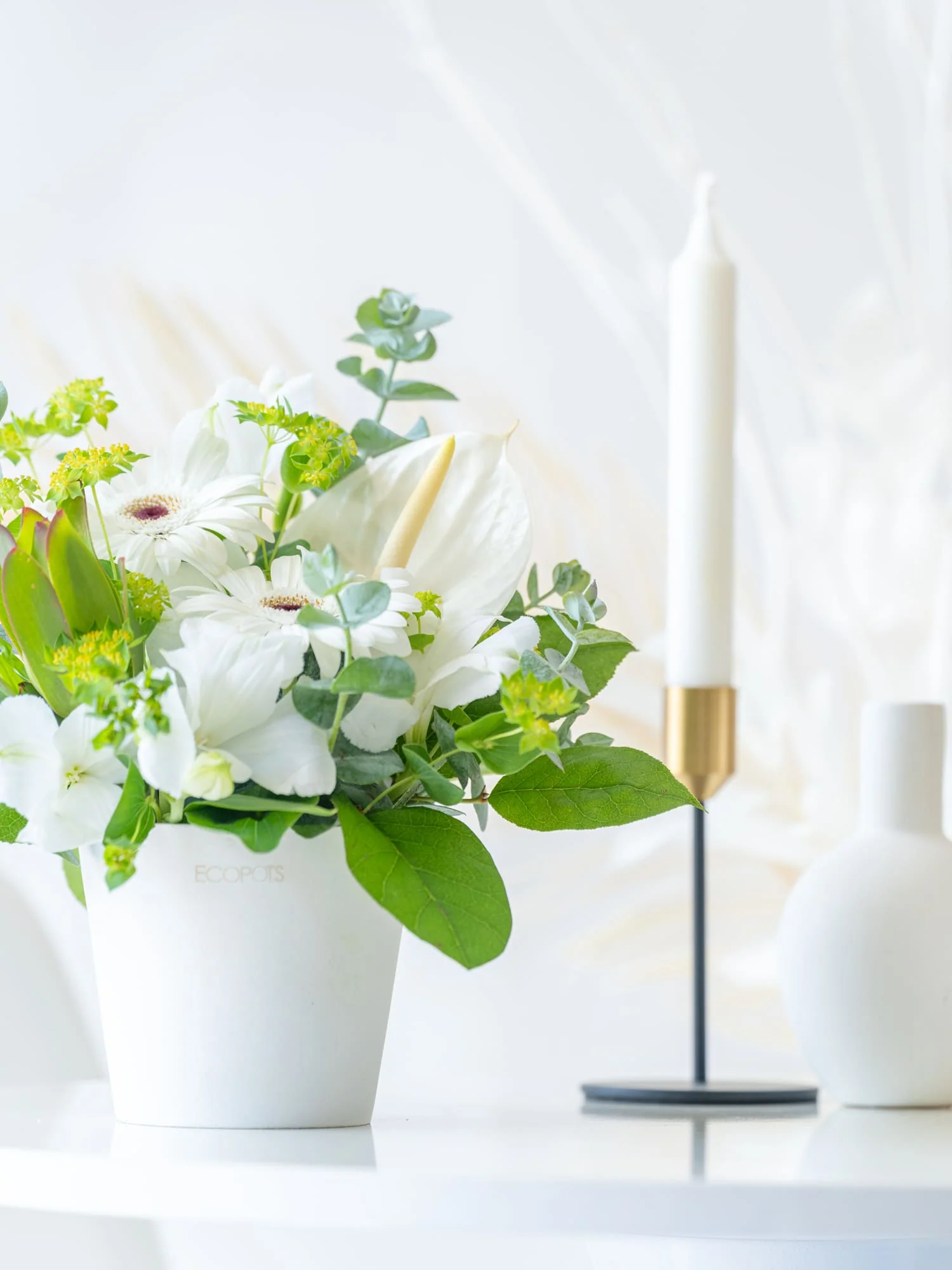 季節に合わせた旬のお花をメイン花材とし、そのお花に合った色味の花材やフレッシュな葉物を組み合わせてご提案します。器が付いた状態ですので、届いてすぐに飾って楽しんでいただけます。