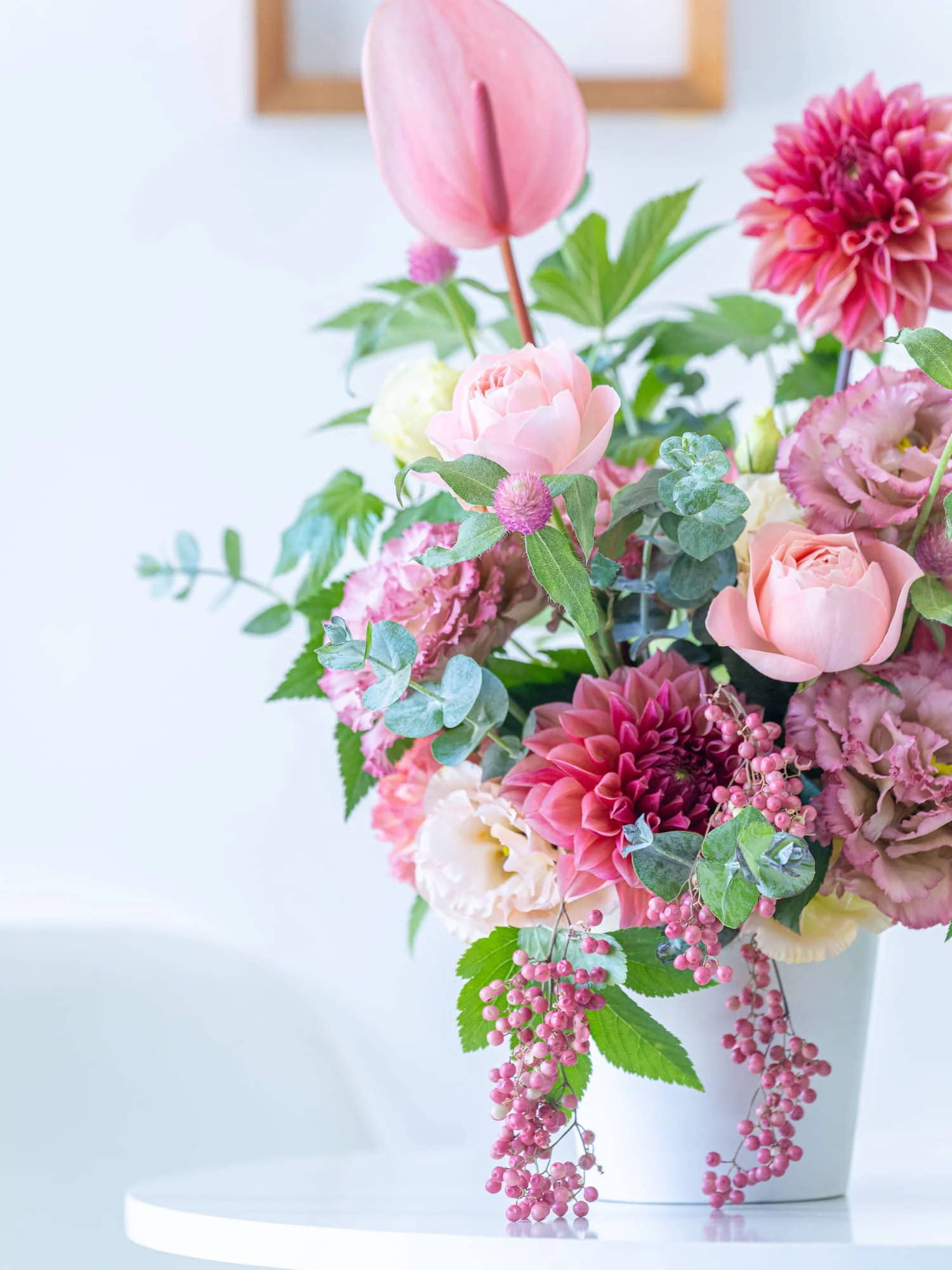 季節に合わせた旬のお花をメイン花材とし、そのお花に合った色味の花材やフレッシュな葉物を組み合わせてご提案します。器が付いた状態ですので、届いてすぐに飾って楽しんでいただけます。