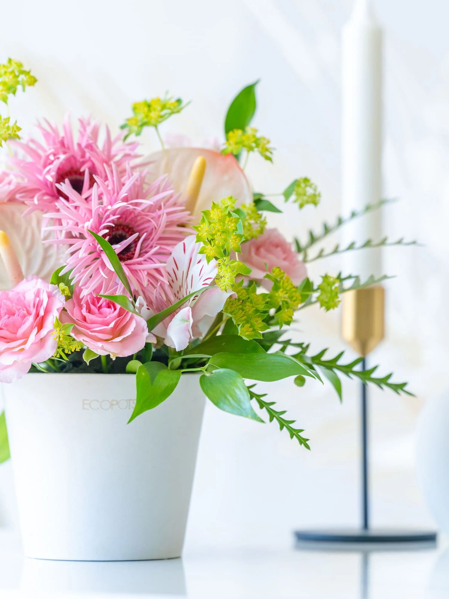 季節に合わせた旬のお花をメイン花材とし、そのお花に合った色味の花材やフレッシュな葉物を組み合わせてご提案します。器が付いた状態ですので、届いてすぐに飾って楽しんでいただけます。