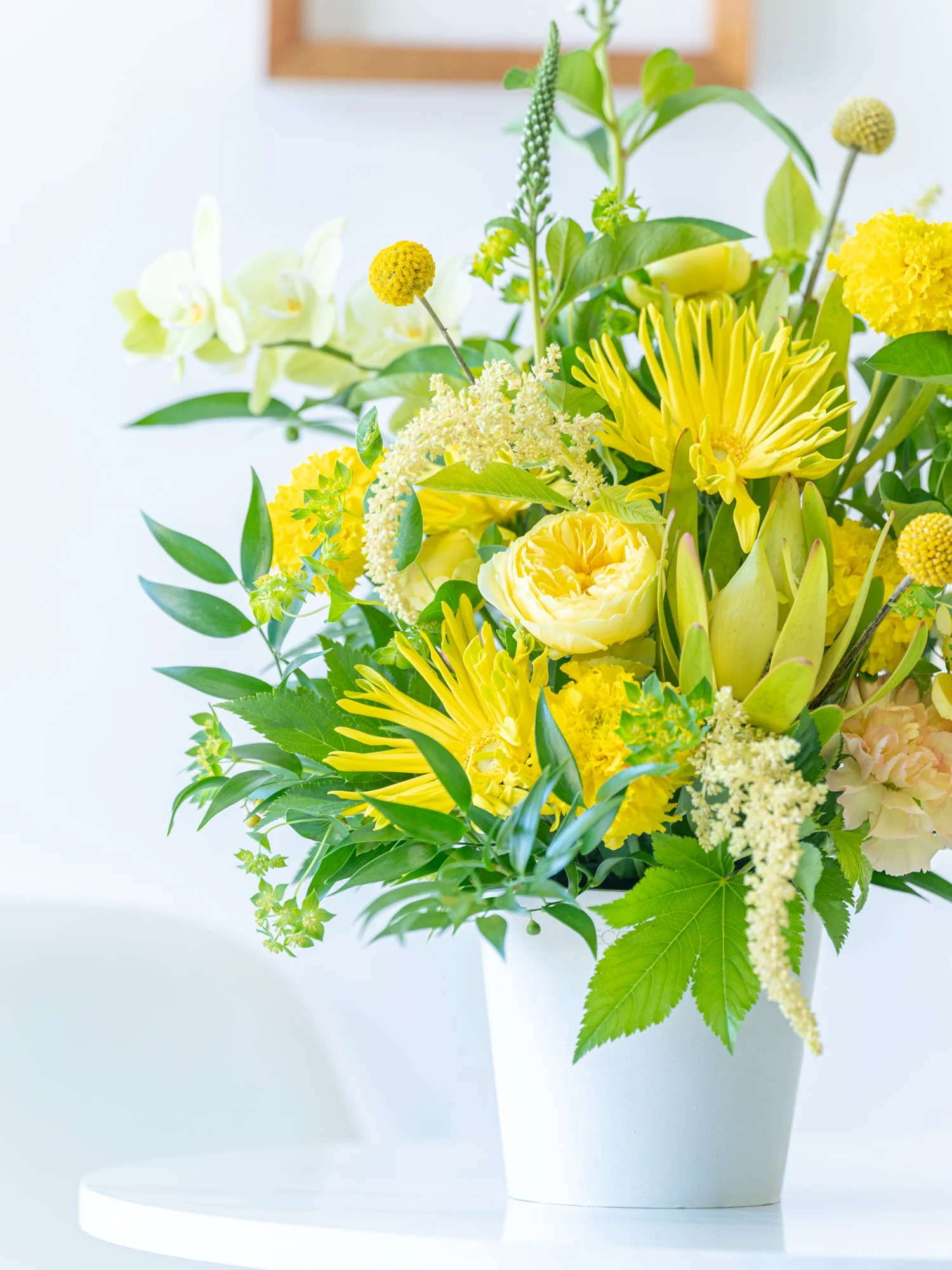 明るく前向きな印象を与えるイエローは、門出のお祝いやカジュアルなギフトにも最適なカラーです。目で楽しむ美しさはもちろん、箱を開けた瞬間に広がるフレッシュなお花の香りも魅力のひとつです。